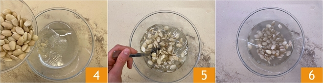 Immerse the peeled almonds in the salted water 4 and stir well to ensure they are all covered in water 5. Leave to soak overnight, or for at least 12 hours 6.