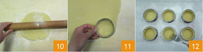 Take the shortcrust pastry from the refrigerator and roll it out to a thickness of about 3/16 in (5 mm) 10, then cut disks with a round cutter 2 3/8 in in diameter (6 cm) 11. Line tartlet tins of the same diameter and prick the bases with the tines of a fork 9. Bake in a preheated fan (convection) oven at 338°F (170°C) for 15 minutes.