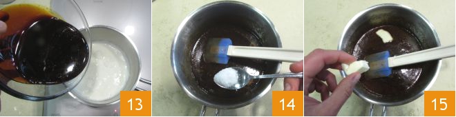 Meanwhile prepare the salted caramel: pour the heavy cream into a small saucepan and bring to a boil, then add the caramel topping 13, stir and wait for it to return to a boil. Let the caramel thicken over medium heat for about 3–4 minutes, then remove from the heat and add the salt 14 and the butter 15. Stir well and set aside temporarily.
