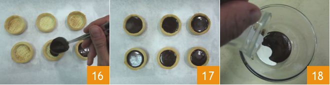 When the tartlet shells are baked, remove them from the oven and let them cool. Once the shells are cool, fill them with the salted caramel 16, reserving one tablespoon of caramel. Place the filled tartlets in the refrigerator to chill for at least 30 minutes 17. Meanwhile, dilute the reserved caramel with 30 g of heavy cream (about 1 fl oz / 2 tbsp) 18 and mix well to combine.