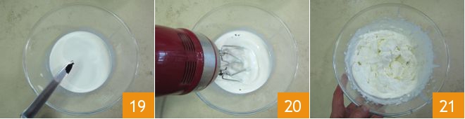 Finally, prepare the whipped cream: pour the heavy cream into a bowl, add the seeds from a vanilla bean 19 and whip with electric beaters 20 until you reach the desired consistency (stiff peaks) 21. Transfer the whipped cream to a piping bag fitted with a 12 mm star tip (about 1/2 in).