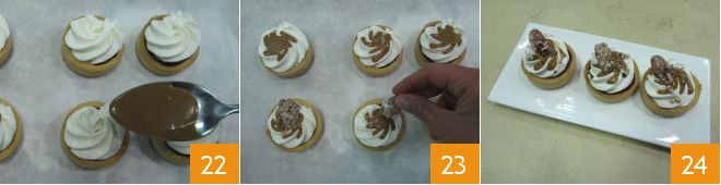 After the chilling time, take the tartlets from the refrigerator and garnish each with a dollop of whipped cream, then drizzle a little caramel sauce 22 and place a pralined nut on top 23. Your salted caramel tartlets with pralined nuts are ready to serve 34!