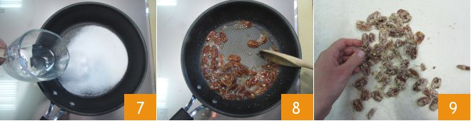 Meanwhile, prepare the pralined nuts: in a non-stick skillet pour the sugar and the water 7 and set over medium-low heat. When the sugar has completely dissolved, add the pecan halves and stir continuously with a wooden spoon 8 until the sugar crystallizes. Pour the pralined nuts onto a sheet of parchment paper and let them cool, separating them with your hands 9.