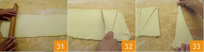 Finally, take the dough and roll it to a thickness of about 2-3 mm until you obtain a rectangle 75 cm wide and 15 cm long. From this, cut 15 triangles with a 4-inch base and 6-inch height 32. At this point, hold firmly with one hand the base of one of the triangles and with the other hand gently stretch the dough to increase its length by 1/4 33.