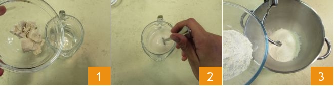 then add the yeast 4 and sugar 5. Turn on the mixer until you obtain a homogeneous dough 6.