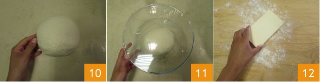 At the end of the rising time 16, transfer the dough to a floured work surface 17 and use the rolling pin to roll it into a 30x30 cm square 18.