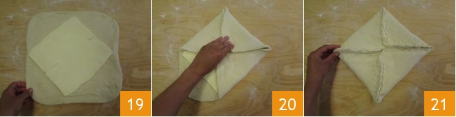 Place the butter block in the center of the square to form a diamond shape 19. Fold the edges of the dough towards the center of the butter block 20, joining the edges but not overlapping them. Seal the edges with your fingers 21. Let rest in the refrigerator for 10-15 minutes.