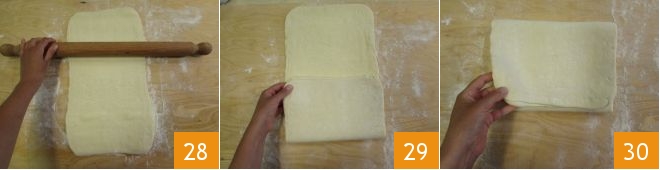 and cover with the other edge 25: the first fold is ready. Cover with plastic wrap and let rest for at least 30 minutes in the refrigerator. Take the dough and place it on the floured work surface again 26; roll it out in the direction of the folds 27