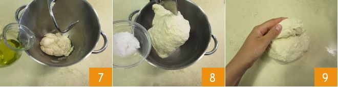 Next, add the oil 7 and allow it to incorporate until the dough clings to the hook. Lastly, add the salt 8 and work for a few more minutes until it's absorbed 8. Transfer to a work surface 9
