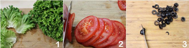 To make the ham sandwiches, start by preparing all the ingredients that will be used for the filling: wash and clean a head of lettuce, divide it into leaves and set them aside 1, then take the tomatoes, wash them and cut them into thin slices 2. Finally, slice the black olives and place them in a small bowl 3.
