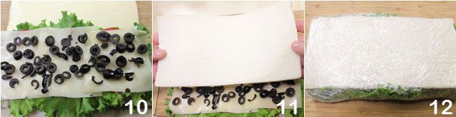and finally, the sliced olives 10. Cover with the other slice of bread 11, then wrap everything in plastic wrap and refrigerate for at least an hour 12. This way, the sandwiches will become even more flavorful and delicious.