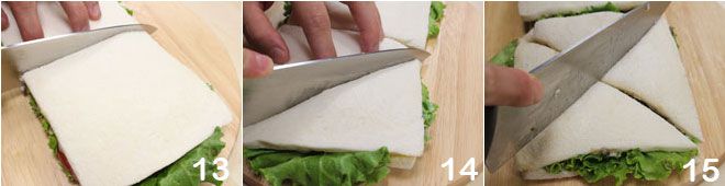 After the necessary time, take your sandwich and cut it in half 13, to form two squares, then cut each square along the two diagonals (14-15), to give the classic triangular shape of the sandwich.