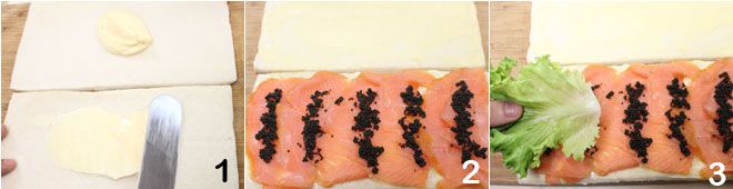 To prepare the salmon sandwiches, start by spreading mayonnaise on two slices of bread 1, then take one and lay the smoked salmon slices on it, with a teaspoon of lumpfish roe on each slice 2. At this point, add the lettuce 3