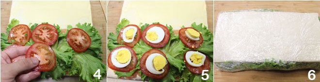 and the tomato 4. Finally, add the sliced hard-boiled egg, placing it on each tomato slice 5. Cover with the other slice of bread and wrap in plastic wrap 6. Let it rest in the refrigerator for at least an hour, then proceed to cut it as indicated above.