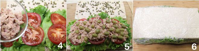 Now add the remaining drained tuna 4, the halved green olives, and cover with the other slice of bread 5. Put the sandwich in the fridge to rest for about an hour, covered in plastic wrap 6, then proceed to cut it following the method described above.