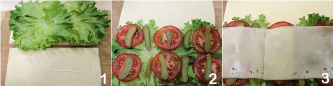 To prepare the vegetarian sandwiches, spread mayonnaise on two slices of bread, then take one and lay the lettuce leaves on it 1. Continue assembling the sandwiches by adding the tomato slices, the sliced cucumber 2, the Edamer cheese slices 3,