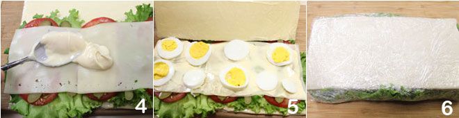 then spread again with a tablespoon of mayonnaise 4. At this point, add the sliced hard-boiled egg and cover with the other slice of bread 5. Wrap everything in plastic wrap 6 and refrigerate for about an hour. After the necessary time, cut the sandwich as described above.