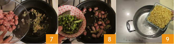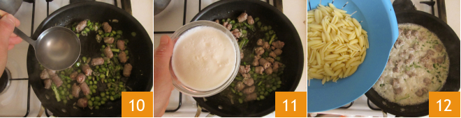 Add the sausage and brown it for a moment 7, then also add the asparagus 8. Let it cook for about 5 minutes and in the meantime, put a pot filled with salted water on the stove that will be used to cook the gnocchetti. When the water boils, cook the pasta al dente 9.