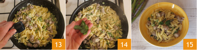 Add pepper 13 and fresh mint 14 and serve the Sardinian gnocchetti with sausage and asparagus hot 15.