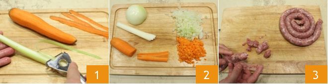 To make Sardinian gnocchi with sausage ragù, start by preparing the sauté following the instructions in the How to make the soffritto guide: remove the ends of the carrot with a knife, peel it with a vegetable peeler, and wash it under running water. Wash the celery stalk and remove the outer fibrous membrane with the peeler 1. Finally, peel the onion and cut it in half. Dice all the vegetables into small cubes 2. Peel the sausage, crumble it, and set it aside 3.