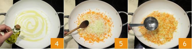 Put the extra virgin olive oil in a pan 4, heat it, then add the chopped onion, carrots, and celery 5. Stir to brown the vegetables on all sides. After 5 minutes, deglaze with broth (or boiling water) 6 and let it cook for another 10 minutes.