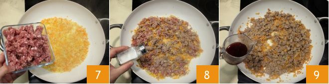 Add the sausage 7, season with salt 8, and deglaze with red wine 9.