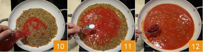 Pour in the tomato sauce 10, add a pinch of sugar to balance the acidity of the tomato 11. Add a tablespoon of tomato paste 12,