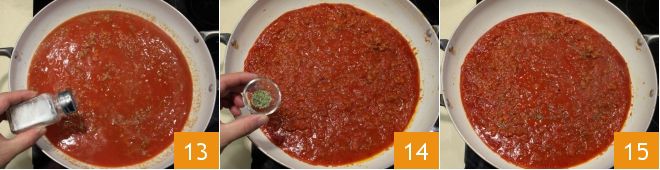 season with salt 13, pepper, and a teaspoon of oregano 14, stir the ragù, and continue cooking over low heat 15 until the sauce thickens, stirring occasionally with a ladle: this will take about 2 hours. Meanwhile, bring a large pot of salted water to a boil, towards the end of the ragù cooking time,