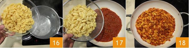 add the gnocchi to the pot of boiling water 16 and cook for about 10 minutes or for the time indicated on the package. When cooked, drain the pasta and add it to the pan containing the prepared ragù 17: toss everything quickly and then serve your Sardinian gnocchi with sausage ragù hot 18.