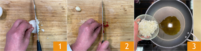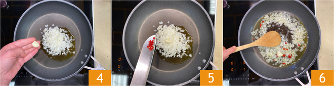Add the garlic 4 and chili pepper 5 and cook on low heat for about 7-8 minutes, stirring occasionally 6.