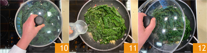 Meanwhile, prepare the black cabbage: remove the central stem 7, wash the leaves well under water, draining the excess 8 and add them to the pan 9.