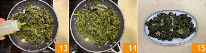 After 20 minutes of cooking, remove the garlic and add the remaining oil, then increase the heat 13 and let it flavor for another minute 14. Your sautéed black cabbage is ready to be served 15!
