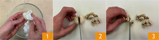To prepare sautéed champignon mushrooms, first trim the end part of the stems, which is usually very dirty with soil, then clean the mushroom caps with a damp cloth 1. First, cut them in half 2 and then into wedges 3. Set aside.