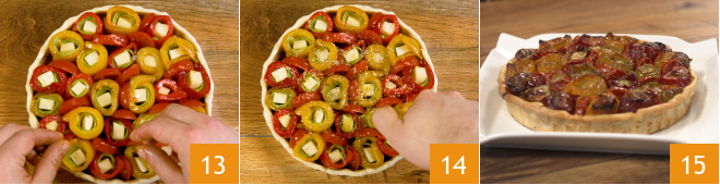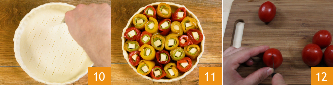 Butter and flour a 6-inch diameter pan, lay the brisée pastry over it, and press it well onto the bottom and sides. Prick the bottom with a fork 10. Place the peppers in the pan 11. Wash and slice the Piccadilly tomatoes 12.