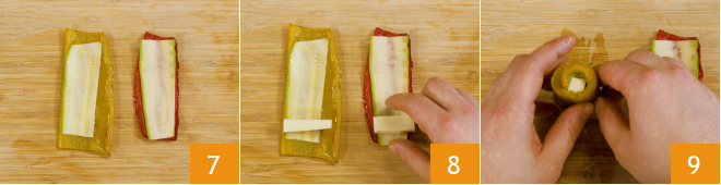 Assemble the rolls: lay a bell pepper slice on a cutting board, place a zucchini slice on top 7, and finally add a strip of scamorza cheese 8 at one end. Roll up the peppers 9 and set them aside.