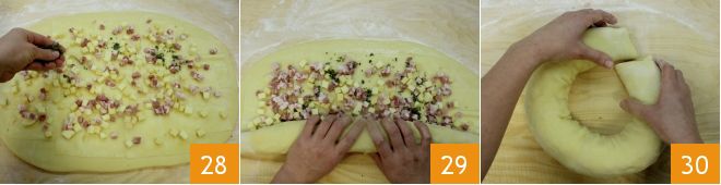 Make them adhere 31 and seal the edges well so that it results in a well-closed ring. Carefully place the ring on a baking sheet lined with parchment paper, brush the surface with beaten egg, and sprinkle it with poppy seeds 32, and let it rise for another hour at room temperature. Then bake the savory ring in a preheated static oven at 356°F for 40 minutes (320°F for 30-35 minutes if using a convection oven). When the ring is cooked, take it out, let it cool slightly, and serve it sliced 33!