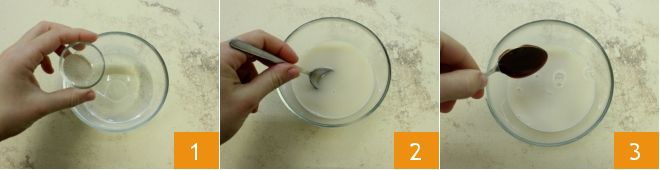 To prepare the savory cheese and bacon ring, start by preparing the starter: place the dry yeast in warm water 1, dissolve it by stirring with a teaspoon 2, then add the malt (or sugar) 3 and stir the ingredients again.