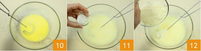 Then beat the eggs together with the water 10 and add the fine salt 11, the grated Parmesan cheese 12, and mix everything.