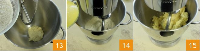 Take a stand mixer equipped with a paddle, place the starter that has meanwhile doubled in volume inside, and pour the Manitoba flour (or all-purpose flour), previously sifted, in a steady stream 13. Turn on the mixer and add the egg and grated Parmesan mixture in a thin stream as well 14. Continue mixing the ingredients with the whisks 15 (if you don't have a stand mixer, you can use an electric mixer with dough hooks for these steps).