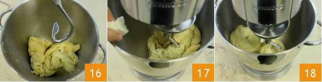 Once the liquids are absorbed, remove the paddle and attach the dough hook 16, then start adding the softened butter in small pieces, one at a time 17; before proceeding to the next piece of butter, let the previous one incorporate perfectly. Continue kneading until the butter is fully combined and the dough is homogeneous 18.
