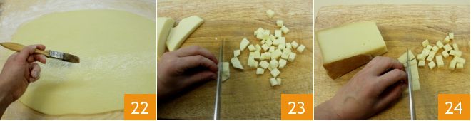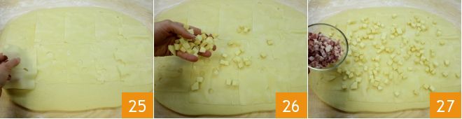 Place the slices of Emmenthal on the sheet 25, then evenly distribute the cheese cubes 26 and sweet bacon cubes 27, leaving about 0.4 inches from the edge.
