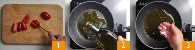 To prepare the savory cheesecake with pesto and cherry tomatoes, first focus on preparing the confit cherry tomatoes. Wash the cherry tomatoes and dry them with paper towels or a clean dish towel, then cut them in half 1. In a pan, pour the oil 2 and add the garlic 3.
