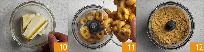 To prepare the base, melt the butter 10, either in the microwave or in a pan on low flame. Put the taralli in a food processor 11 and blend them to a powder 12.