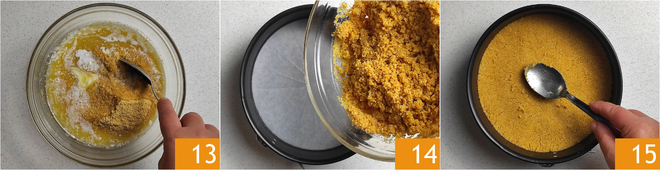 Transfer the blended taralli into a bowl and pour in the melted butter, then mix 10 until you get a sandy consistency. Pour the mixture into an 8-inch diameter mold 20, previously buttered and lined with parchment paper. Level with the back of a spoon 15. Place the mold in the refrigerator to firm up the base.