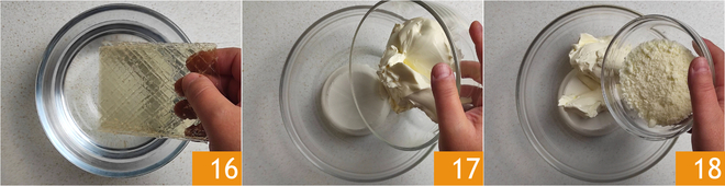 Soak the gelatin in cold water 16. In the meantime, prepare the cheese cream: in a bowl, combine the ricotta, cream cheese 17, and grated Grana Padano DOP 18.