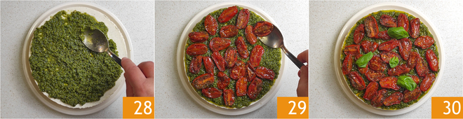 After the resting time, remove the cheesecake from the mold and spread the pesto on the surface 28. Garnish with the confit cherry tomatoes 29 and a few basil leaves 30. The savory cheesecake with pesto and cherry tomatoes is ready to be enjoyed!