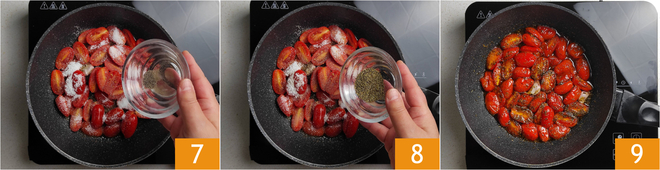 Also season with pepper 7 and oregano 8. Cook on high flame for about 8 minutes, or until the sugar has caramelized 9. Set aside the confit cherry tomatoes.
