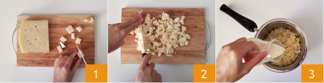 To make the savory cream with mushrooms and bacon, first cut the Asiago into cubes 1 and then chop it with a knife 2. Transfer the cheese into a small pot, pour in the milk and cream 3