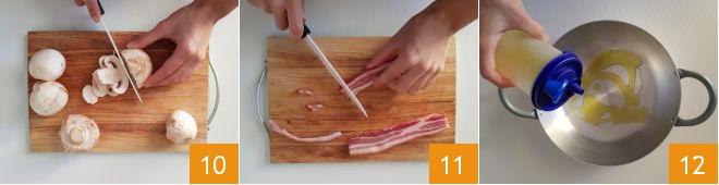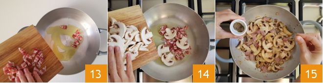 Thinly slice the mushrooms 10 and then cut the bacon into cubes 11. Pour a dash of oil into a pan 12