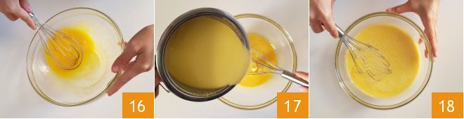 In a bowl, beat the yolks of 5 eggs with the whole egg 16, add the mixture to the now cold cream 17, and mix well to combine 18.